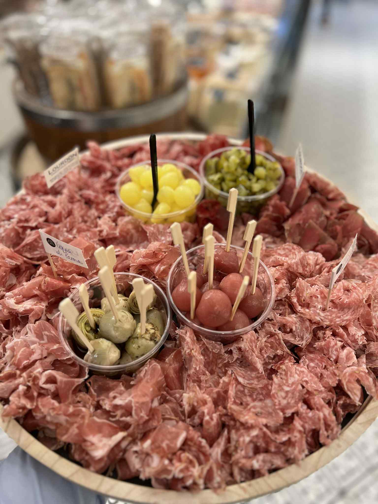 Vier verfijnde vleeswaren waaronder viande des Grisons met ajuintjes, augurkjes en artisjokhartjes. Allemaal mooi gepresenteerd op een plank.