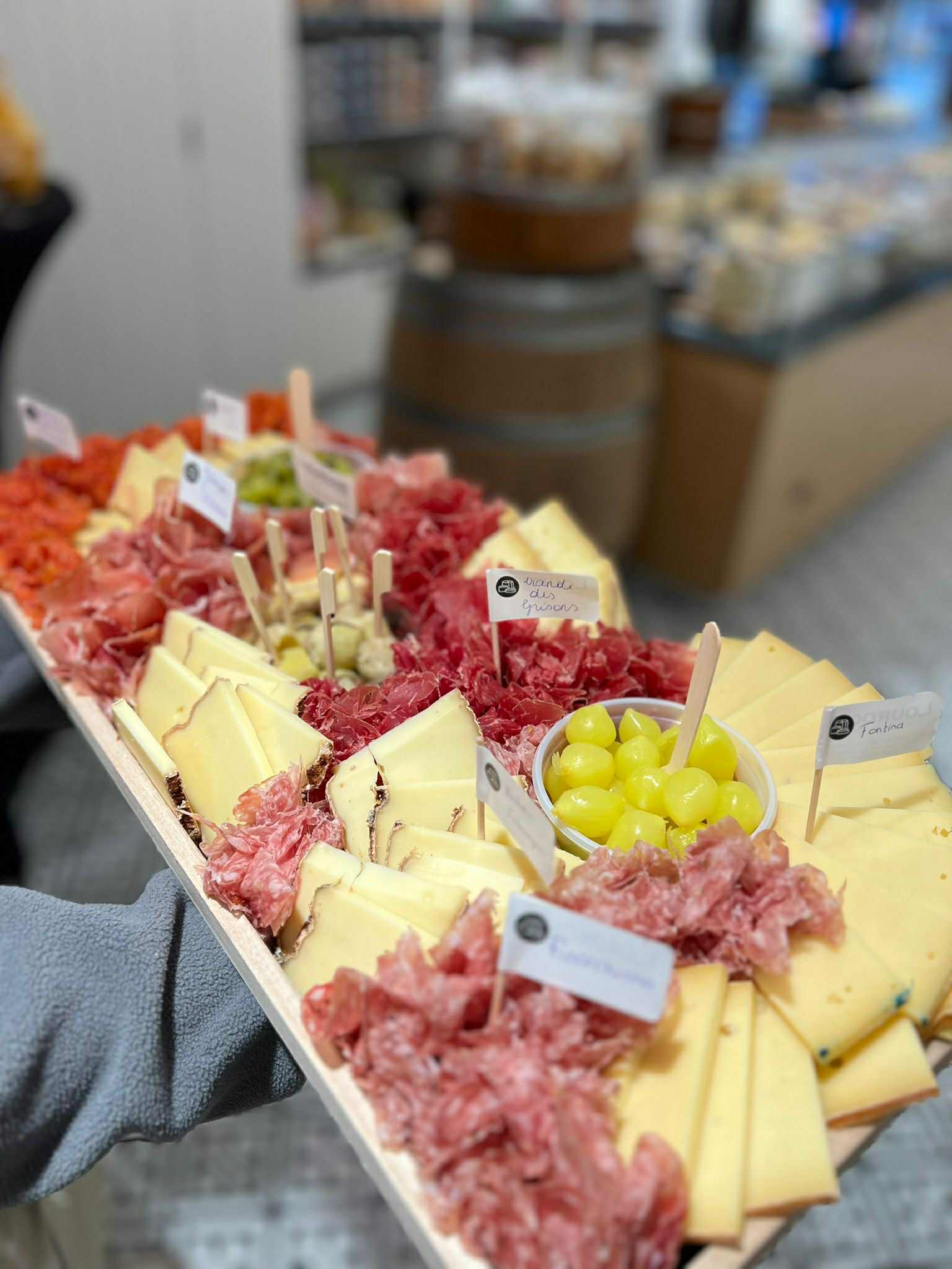 Vier verfijnde vleeswaren waaronder viande des Grisons met ajuintjes, augurkjes en artisjokhartjes. Allemaal mooi gepresenteerd op een plank.